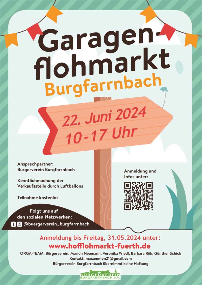Bereits zum zweiten Mal verkaufen die Burgfarrnbacherinnen und Burgfarrnbacher am Samstag den 22. Juni 2024 von 10 bis 17 Uhr ihre Schätze in der Garage, im Hof oder in der Scheune.