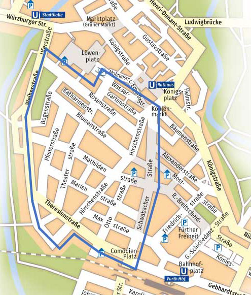 Die Gebietsgrenzen sind auf folgendem Plan abgebildet. Das Flohmarktgebiet umfasst den Innenstadtbereich zwischen Weiherstraße, Rosenstraße, Schwabacher Straße und Theresienstraße.