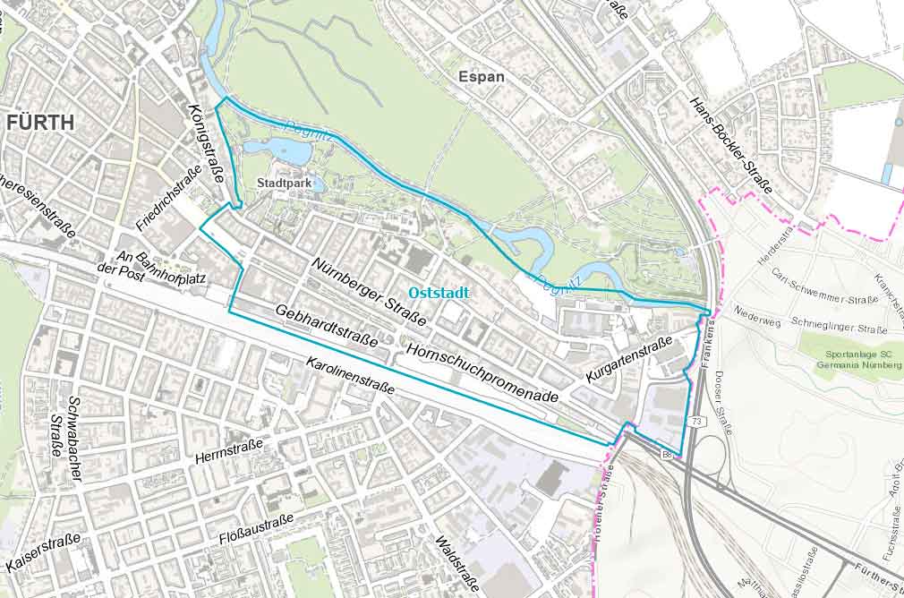 Am Samstag, den 06.07.2024, soll von 10 bis 16 Uhr der zweite Hofflohmarkt in der Fürther Oststadt stattfinden. Die Gebietsgrenzen sind im Plan unten abgebildet.